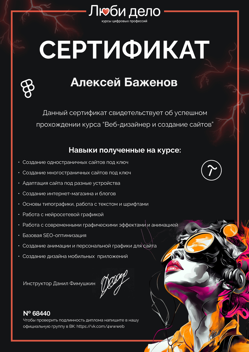 курс по созданию сайтов. В профессии недавно, страстно люблю её, постоянно учусь и развиваюсь. Сейчас я наконец осознал, что дизайн это моё призвание и безмерно этому рад!